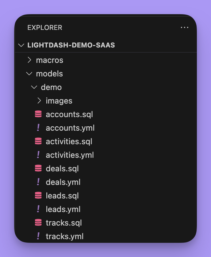 We recommend structuring your dbt project with one .yml file per model (or .sql file). We’ve found that this makes it easier to navigate through your .yml files and easier to manage your dbt models, especially as your project becomes bigger. Here’s an example of our dbt project at Lightdash too see what that looks like in practice: